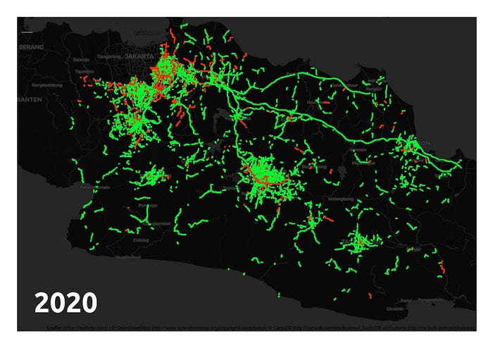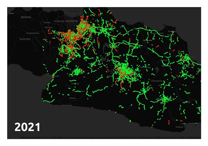 Dibandingkan dengan tahun 2020, peta perubahan kemacetan (Gambar 7) tahun 2021 tampak lebih merah di wilayah Bodebek dan Bandung Raya. Tidak adanya larangan untuk melakukan mobilisasi di wilayah aglomerasi membuat masyarakat memilih untuk berpergian atau bahkan berwisata di dalam kota.