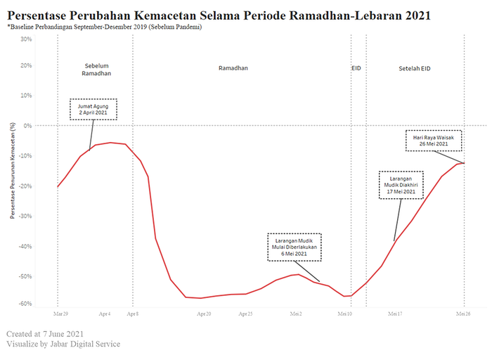 Mendukung kebijakan larangan mudik, Pemerintah Daerah Provinsi Jawa Barat mendirikan 50 titik penyekatan untuk mengawasi masyarakat yang ingin keluar-masuk kawasan tertentu, seperti wilayah PSBB, zona merah penyebaran Covid-19, dan wilayah aglomerasi yang telah ditetapkan PSBB, misalnya Bodebek (Kabupaten dan Kota Bogor, Kota Depok, Kabupaten dan Kota Bekasi) dan Bandung Raya (Kota Bandung, Kabupaten Bandung, Bandung Barat, Kota Cimahi dan Kabupaten Sumedang). Hal ini berdampak pada penurunan arus lalu lintas sebesar 77% pada periode mudik Lebaran (Gambar 3).